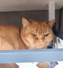 Red liegt gerne in seiner Hängematte und hat alles im Blick. Leckerchen lässt er sich gerne reichen und genießt auch eine kurze Streicheleinheit. Auf fremde Menschen zuzugehen fällt ihm schwer. Empfindet er eine Situation als "gruselig", entfernt er sich. Kleinere Kinder sollten nicht im neuen Haushalt leben. Er sucht gemeinsam mit Kater Namor ein Zuhause. |