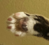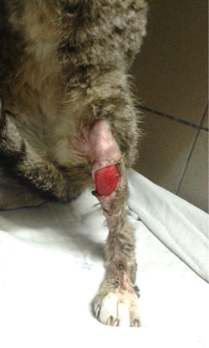 Dann ist mir bei einem Streifzug durch´s Revier was schlimmes passiert, ich bin wohl über ein Gartentürchen mit Spitzen obendrauf gesprungen, dabei bin ich mit meinem Hinterbeinchen hängengeblieben und habe mir fast die ganze Haut am Beinchen abgerissen. Dass hat vielleicht weh getan!